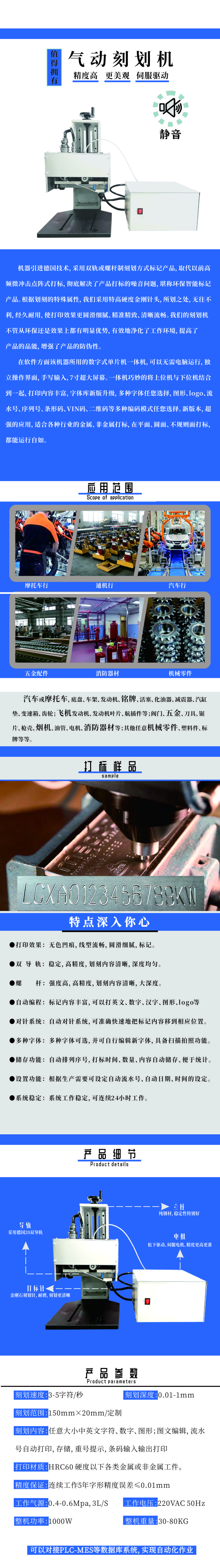 氣動劃刻機是氣動打標機的其中一種,刻劃是指用硬質合金或金剛石針在材料表面刻出文字和LOGO等,在圓面,平面,凹面或供面上刻出凹槽而形成連續直線,并且適用于任何材質。也被稱為“劃線”式打標。其適用于車架號、不銹鋼、法蘭、發動機號、銘牌、鋼瓶等多種行業加工,特別適用于對劃刻深度有特殊要求:如汽車VIN、鋼材熱處理前標識、閥門深度、石油管道標識等。